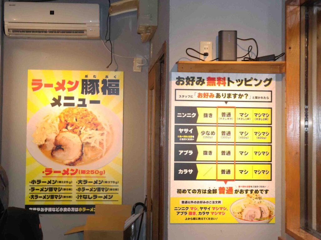 メニューは小ラーメン(麺125グラム、豚2枚)が950円、ラーメン(250グラム、豚2枚)が1000円、大ラーメン(麺375グラム、豚2枚)が1100円=いずれも税込)。スタッフに「お好みありますか?」と聞かれたら、ニンニク、ヤサイ、アブラ、カラサの無料トッピング段階を“コール”で伝える。初心者でも優しい二郎系の店だといい「『ニンニク、ヤサイ、マシマシ』それを食べられるぐらいまで通ってください」と関大生に呼びかけた。