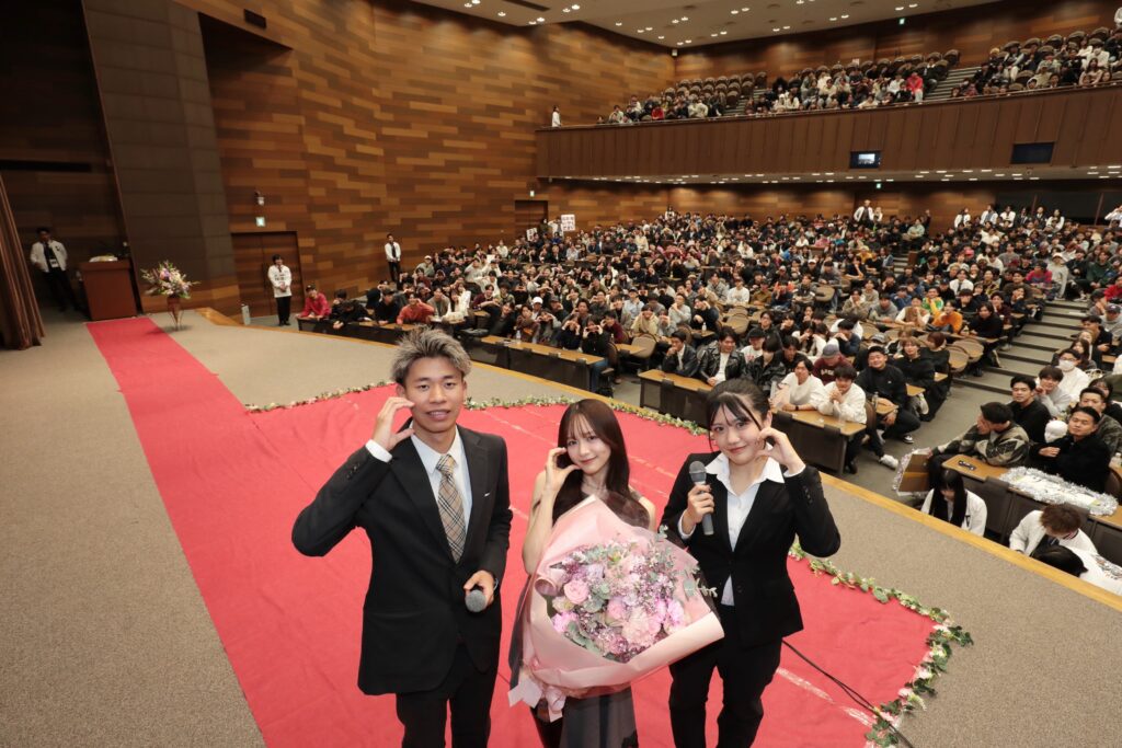 森さんは「実際、ボディータッチをしないってことなんです。あざといとか、そういう女の子が狙ってるみたいなのって、男性もけっこう免疫はありますよね。初対面でベタベタ触ってくる女の子を大切にしようとは思わないじゃないですか。そういう時はあえて、絶対触れられないような位置に行くようにして目線だけ。しゃべってて好きな人がいたら…」と実際に“熱視線”を実演すると、会場のあちこちで身悶える男子学生が続出した。
