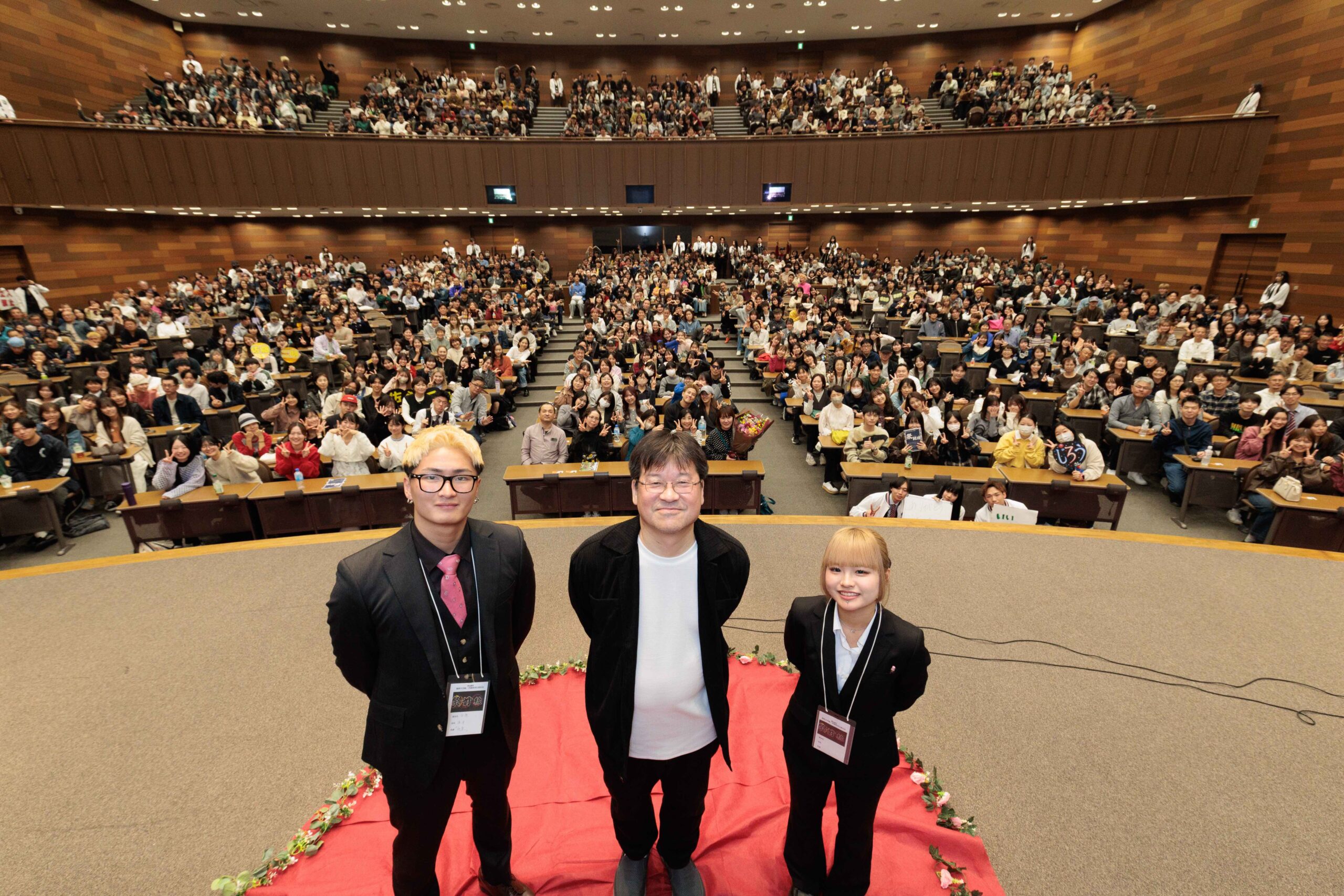 俳優・山田裕貴さんとのW主演映画「爆弾」が公開中。「ここに来るんだったら『爆弾』を見なさい」との毒舌で場内を沸かせる。ハプニングで予定通りの進行ができず、戸惑う司会の学生に「スモーク出して、オープニングムービー流して。せっかくなんで使いましょう」とフォロー。進行役の学生や、質問コーナーで発言した学生の名前を聞く優しさを見せた。