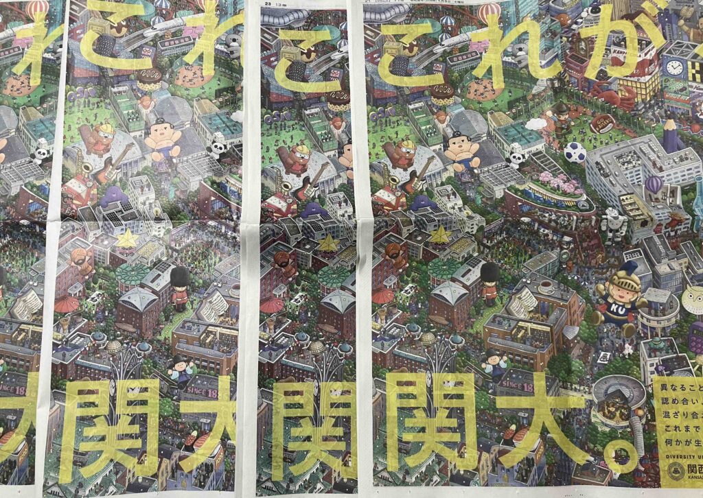 多様な個性が自然に交わる〝関大らしさ〟を表現したキャンパスのイラストで、絵本「迷路探偵ピエール」シリーズで知られる広島拠点の世界的デザインスタジオ・IC4DESIGN(アイシーフォーデザイン)が手がけた。関西大学によると、キャンパスビジュアルは今回の新聞広告出稿以後、2026年度の広報活動でポスターや冊子、ウェブに展開。多文化共修を中心とした大学の取り組みを発信するキービジュアルとなるという。