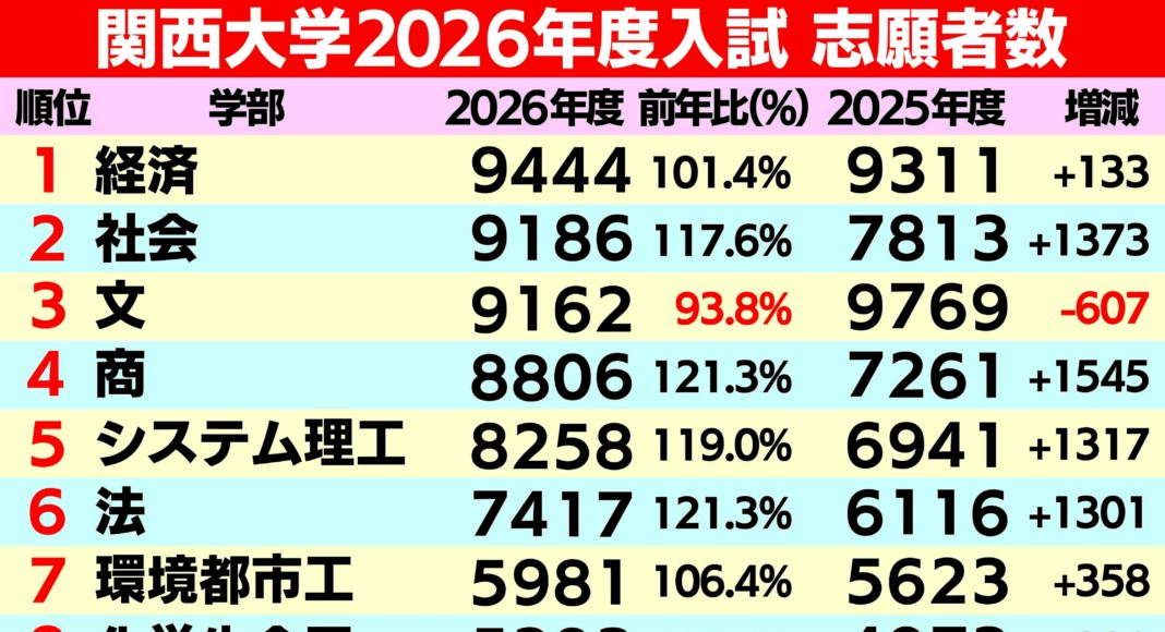 「大学ランキング2026」(朝日新聞出版)調べのお笑い芸人の出身大学別ランキングで、関西大学が2022年から3年連続で守ってきた1位の座を明け渡し、2位に後退した。M-1、R-1グランプリ、キングオブコント、THE Wなど、お笑いの各賞レースファイナリストの延べ人数から集計した。1位は日大だった。