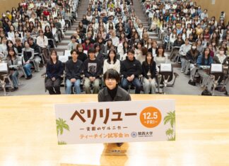 太平洋戦争の激戦地となったパラオ・ペリリュー島の戦いを題材にしたアニメ映画「ペリリュー ー楽園のゲルニカー」(12月5日全国公開)の関大生向け「ティーチイン試写会」が1日、千里山キャンパスで行われた。映画上映後、主人公役の声優を務めた俳優の板垣李光人さん(23)が登壇。社会学部齊藤潤一ゼミの学生らと、戦争と平和について討論した。