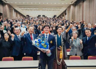 プロ野球セ・リーグの中日からドラフト1位指名され、背番号「21」を身につけることが決まった関西大学体育会野球部の金丸夢斗投手(文4)が17日、関西大学千里山キャンパスで開かれた大学主催の壮行会に出席。関大生400人が、プロの世界に挑む左腕にエールを送った。