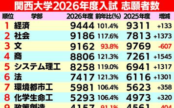 関西大学が、2026年度入試のうち一般入試、共通テスト利用入試(併用、前期)の志願者数が確定したとして公表した。